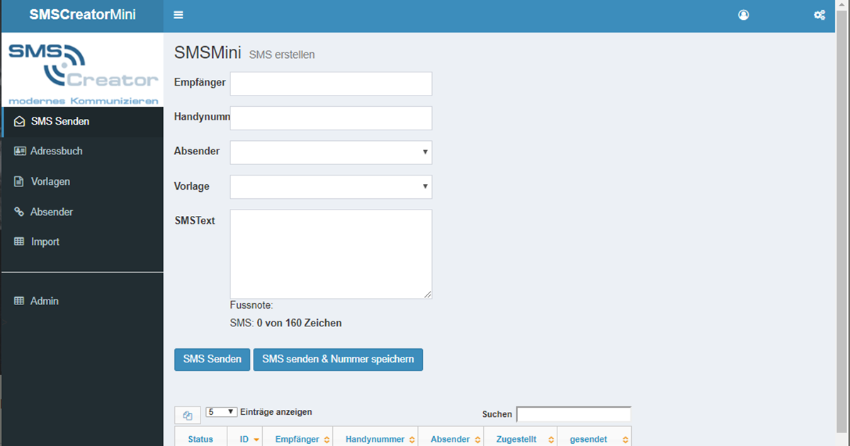 Mit dem neuesten Produkt aus der SMSCreator Familie haben Sie Ihre Firmenkommunikation im Griff. Mit einer einfachen Administrationsoberfläche können Sie Benutzer hinzufügen, die dann wiederum SMS versenden können. So kann das SMS Kontingent im ganzen Unternehmen genutzt werden. Mit einem Ampelsystem sehen Sie, welche SMS zugestellt wurden oder welche den Empfänger noch nicht erreicht haben.