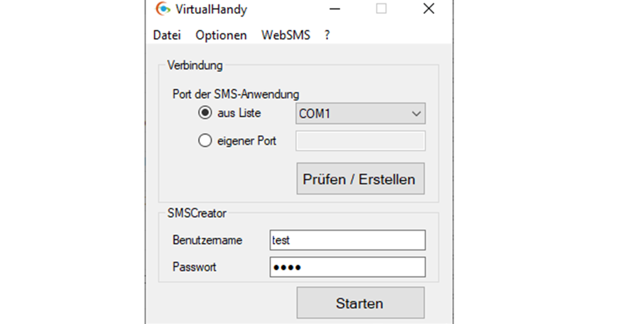 Mit dem virtuellen Modem ist es möglich, eine Modemhardware zu emulieren. Mit dieser virtualisierten Hardware könne dann SMS Kurznachrichten aus allen Anwendungen gesendet werden, die ein angeschlossenes SMS Gateway benötigen. Sie sparen sich also Mobilfunkverträge und teure GSM Modems ohne auf die Funktionalität verzichten zu müssen. Nach der Installation des virtuellen Modems wird in einem einfachen Menü, der gewünschte Com-Port und die SMSCreator Zugangsdaten gesetzt. Damit ist das Gerät einsatzbereit und kann sofort verwendet werden.